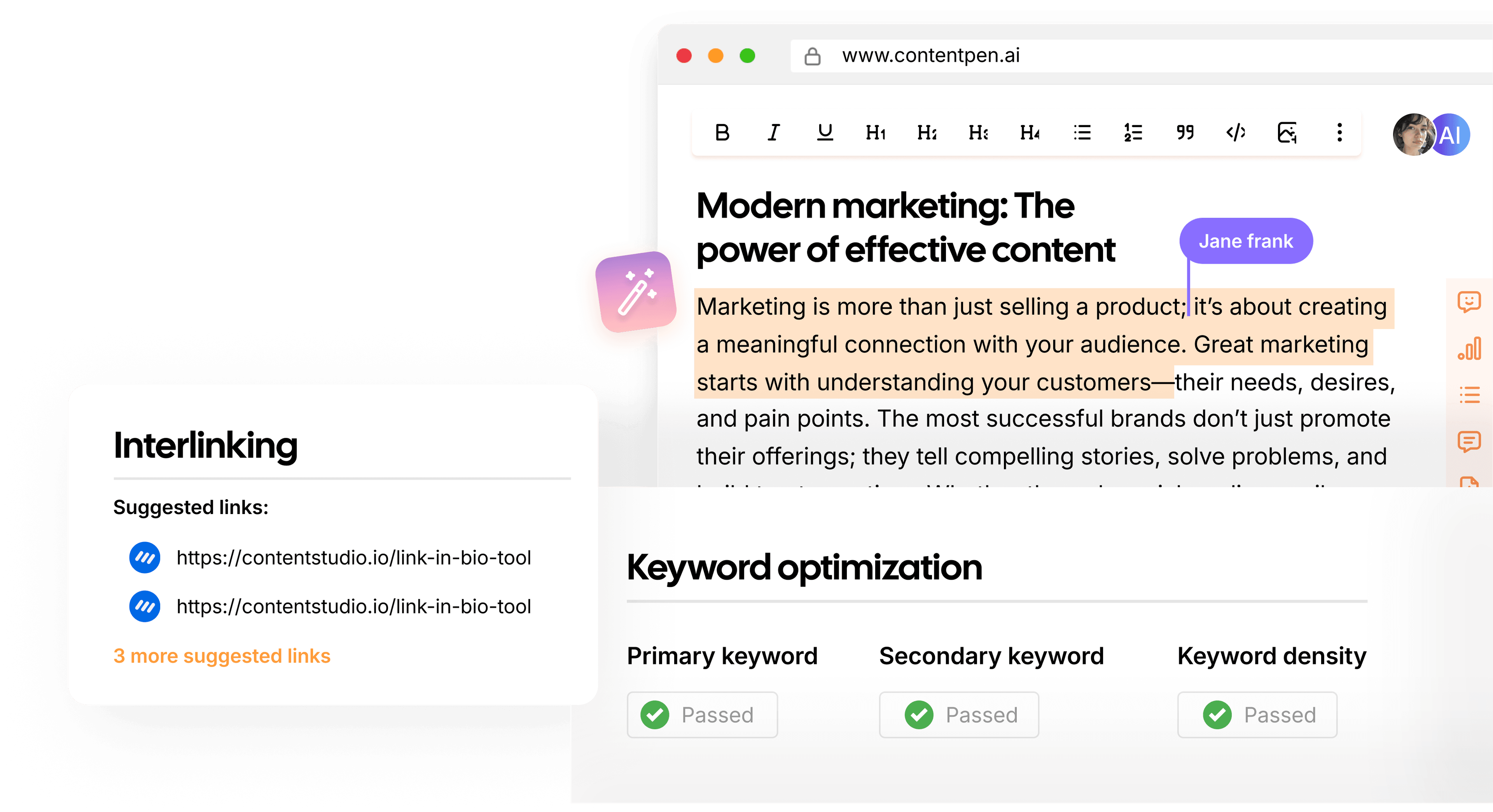 From planning and writing to SEO scoring interlinking, and post-publish updates, the workflow stays connected.